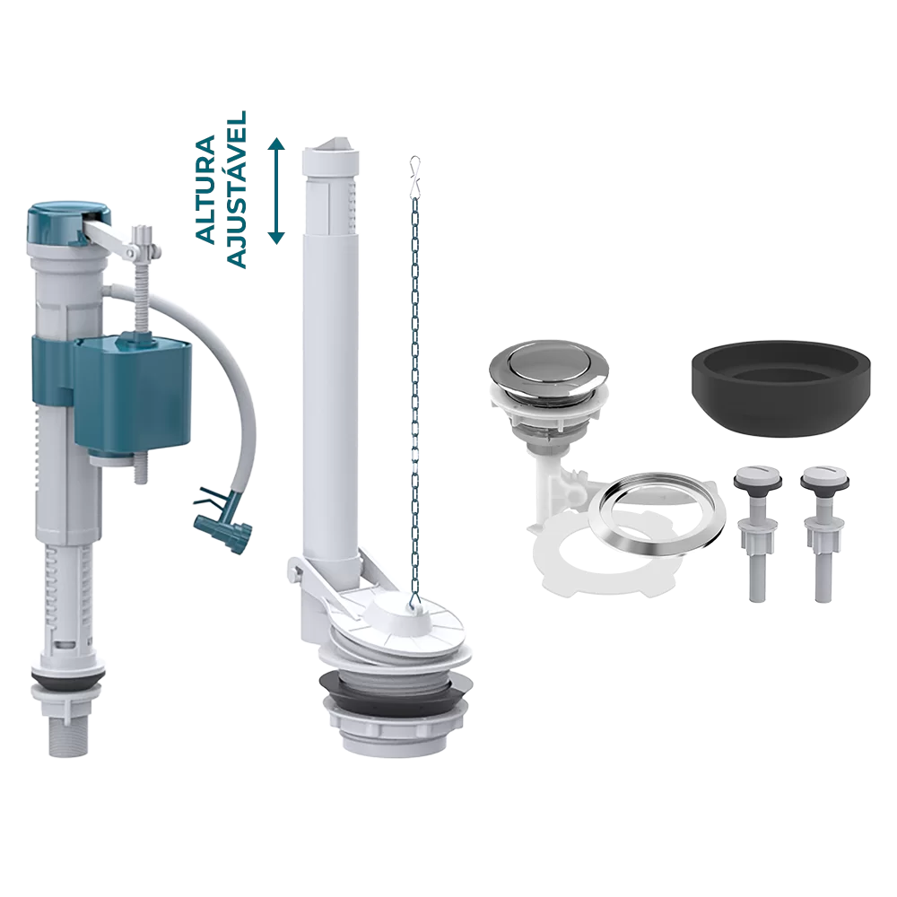 O kit reúne mecanismo de entrada com altura ajustável, mecanismo de saída convencional e acionador superior, proporcionando enchimento eficiente, descarga confiável e instalação simples.